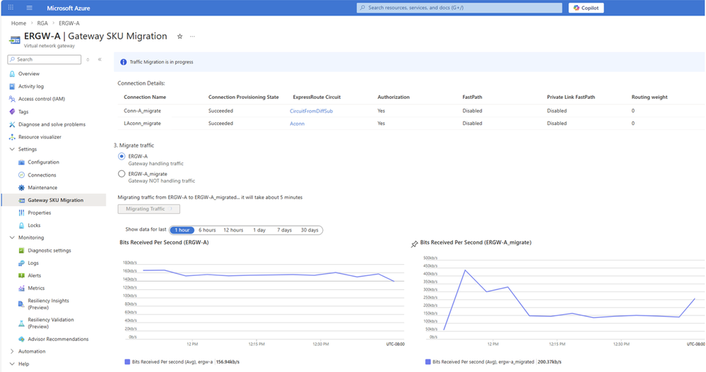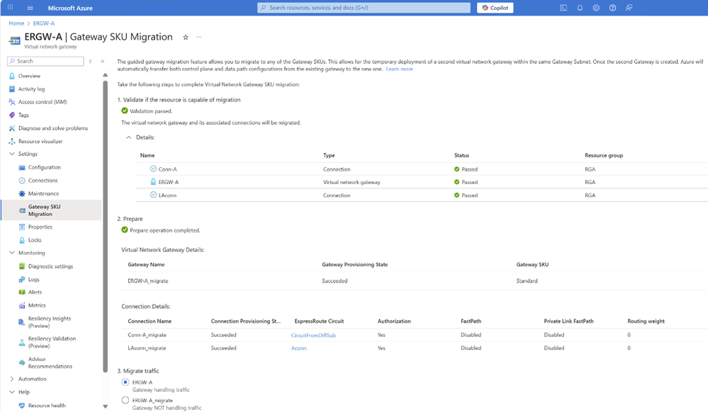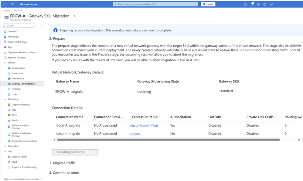 After the Prepare stage finishes, the backend process starts the Migrate stage. During this stage, the process switches traffic from the existing gateway ERGW-A to the new gateway ERGW-A_migrate.