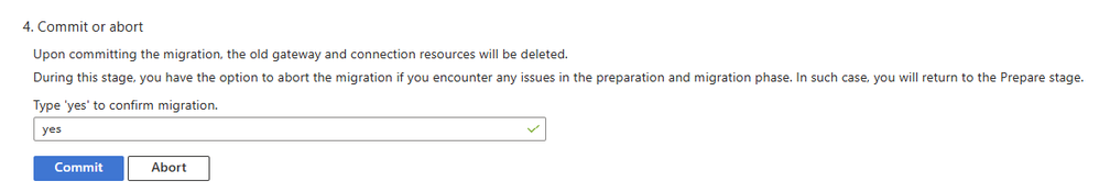Avoid making non-critical changes to the deployment (gateway resources, connected circuits, etc.). If modifications are absolutely required, you have the option (after the Migrate stage) to either commit or abort the migration.