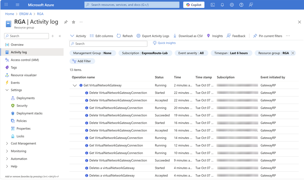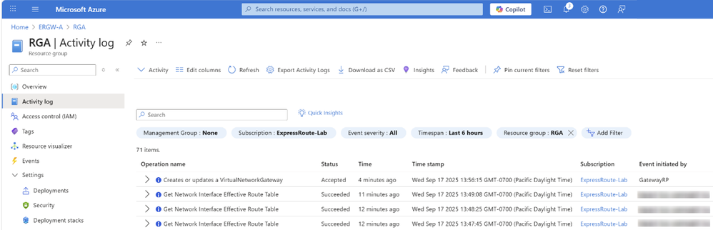 In the resource group RGA under the Activity Log blade, you can see events related to the Prepare stage. These events are initiated by GatewayRP, which indicates they are part of the backend process: