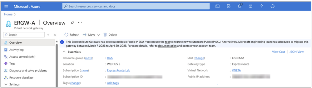 Before the backend migration starts, a banner appears in the Overview blade of the ExpressRoute gateway. It notifies you that the gateway uses the deprecated Basic IP SKU and will undergo backend migration between March 7, 2026, and April 30, 2026: