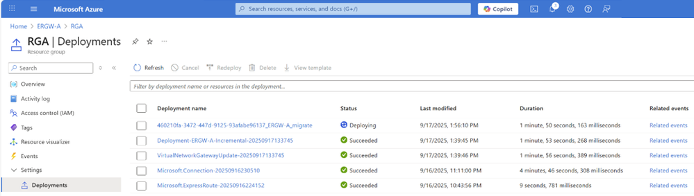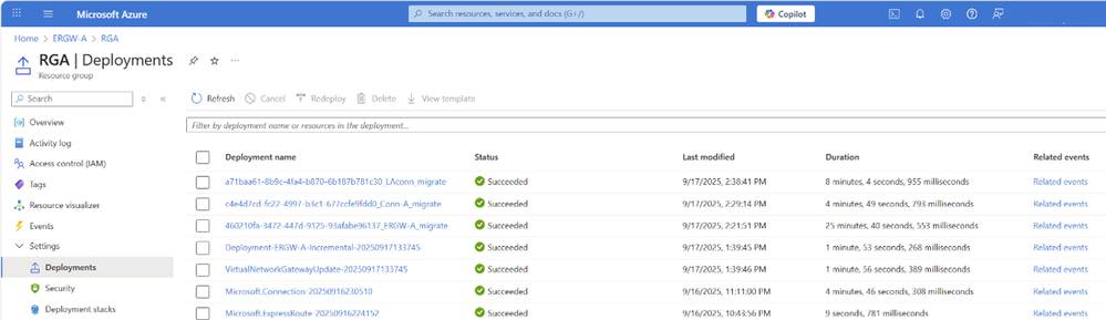 In the resource group RGA, under Settings → Deployments, you can view the status of all newly deployed resources as part of the backend migration process.