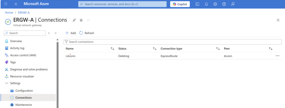 This image uses an example ExpressRoute gateway named ERGW-A with two connections (Conn-A and LAconn) in the resource group RGA.