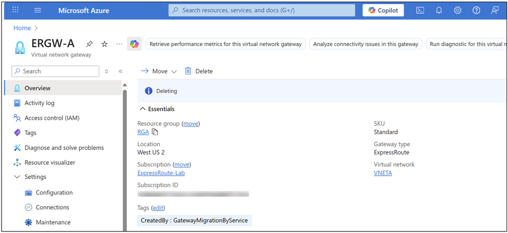 The newly created gateway ERGW-A_migrate includes the tag CreatedBy: GatewayMigrationByService, which indicates it was provisioned by the backend migration process.