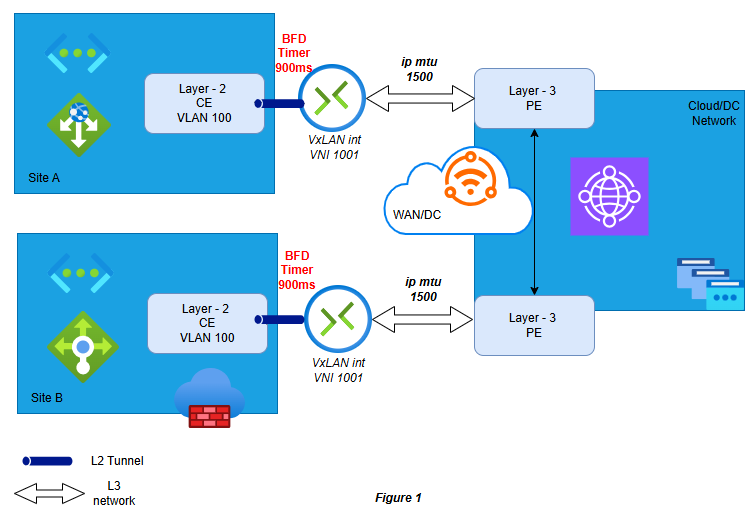 Figure 1: Two sites (A and B) extend “VLAN 100” across an IP WAN using a VXLAN tunnel. The inner VLAN tag is preserved over the L3 network. A BFD keepalive (every 900ms) runs between the VXLAN endpoints to detect failures.