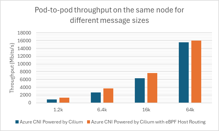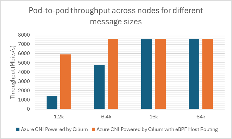 For pod-to-pod throughput across different nodes in the cluster. eBPF host routing results in better pod-to-pod throughput across nodes, and the difference is more pronounced with smaller message sizes (3x more). This is because, with smaller messages, the per-message overhead incurred in the host network stack has a bigger impact on performance.