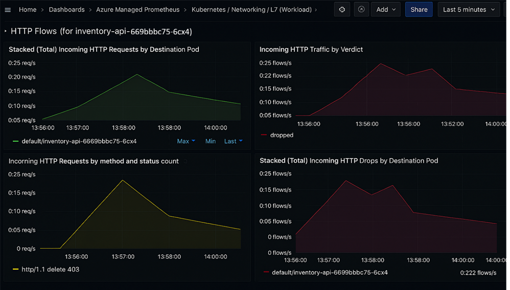 In our example above, the blocked DELETE request isn't silent. It is immediately visible in your Azure Managed Grafana dashboards as a "Dropped" flow, attributed directly to the protect-inventory-api policy. This makes security incidents auditable and easy to diagnose, enabling operations teams to detect misconfigurations or threats in real time. Below is a sample dashboard layout screenshot.