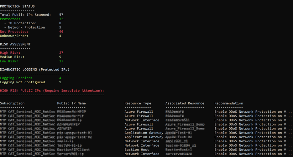 Organizations need visibility into their DDoS Protection posture across all Azure subscriptions. This guide introduces a PowerShell script that assesses DDoS Protection status, diagnostic logging configuration, and risk levels for all Public IP addresses.