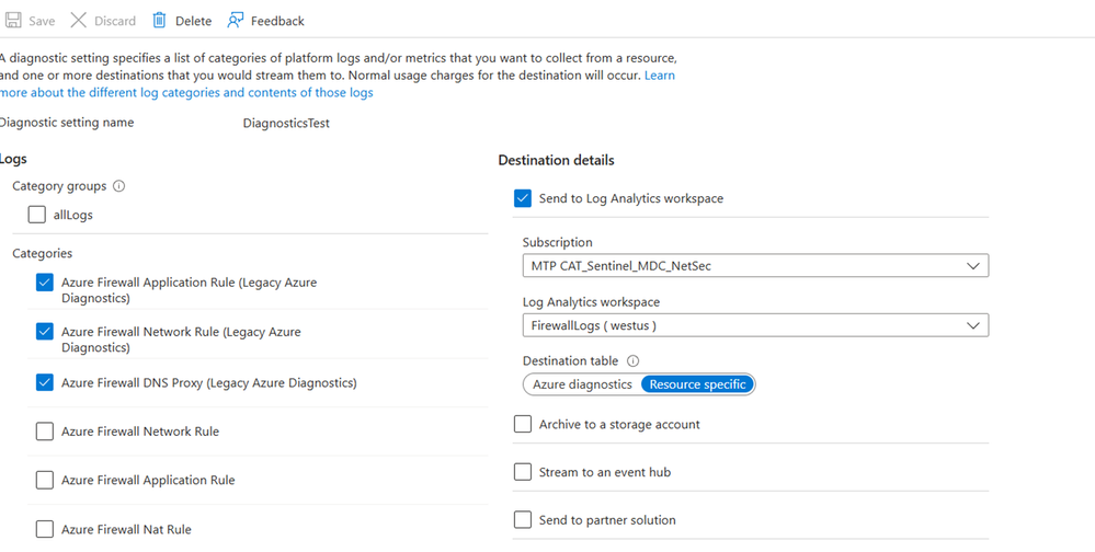 Below is an example of how to set up diagnostic settings by linking the firewall to a Log Analytics workspace: