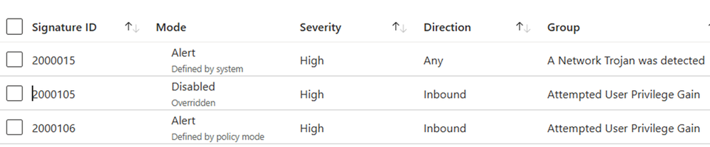 - Signature ID 2000105 is overridden and set to Off, which appears as Disabled in the Azure Portal.