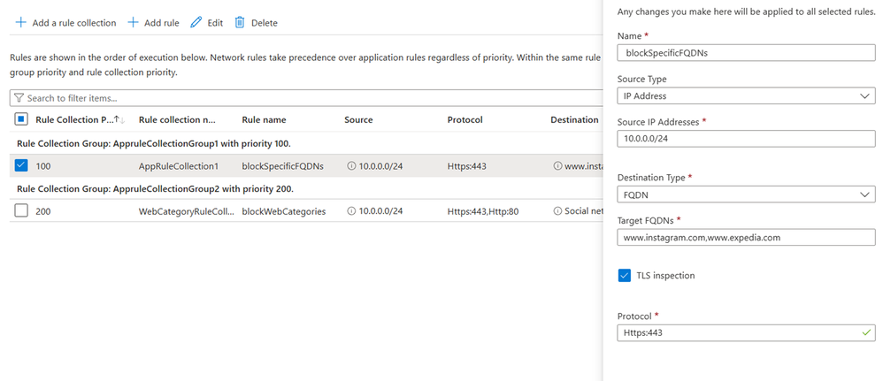 When this PUT request is successful, the following rule will be created to block access to the specified target FQDNs from the 10.0.0.0/24 source IP address range, as shown below: