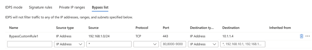 - A custom bypass rule is configured to exclude specific traffic (based on source IP, destination IP, and port) from IDPS filtering.