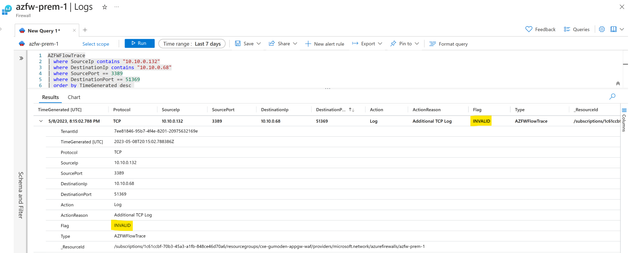 As we can see in the above image, when we look at the initial traffic on the firewall there are no logs as expected as the firewall was not in the path. However, when we look at AZFWFlowTrace logs, we can see that there is a log for the return traffic in the opposite direction and this packet has been marked as invalid by the firewall as the Azure Firewall is stateful and keeps track of TCP connections. In this way we can easily troubleshoot different asymmetric routing scenarios and invalid TCP connections using the new Flow Trace logs.