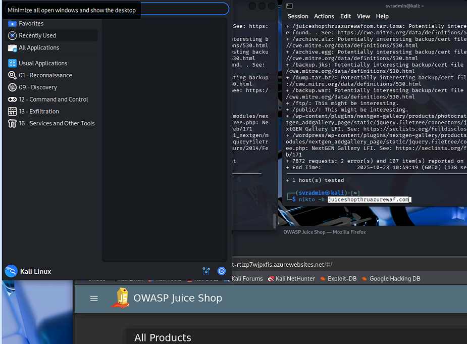In this setup, traffic from the attacker machine (Kali VM) will be routed to the internet through the Azure Firewall. Successful attack path is one where malicious data is sent directly by the attacker to the OWASP Juice Shop web application leading to successful exploitation. Attack path defended by WAF represents the path where malicious data is inspected by Azure WAF (on Azure Application Gateway) and blocked with its out of the box ruleset before it reaches the web application.