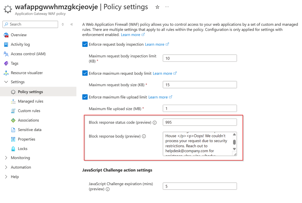 - Limit: Up to 20 WAF policies with custom block response per Application Gateway.