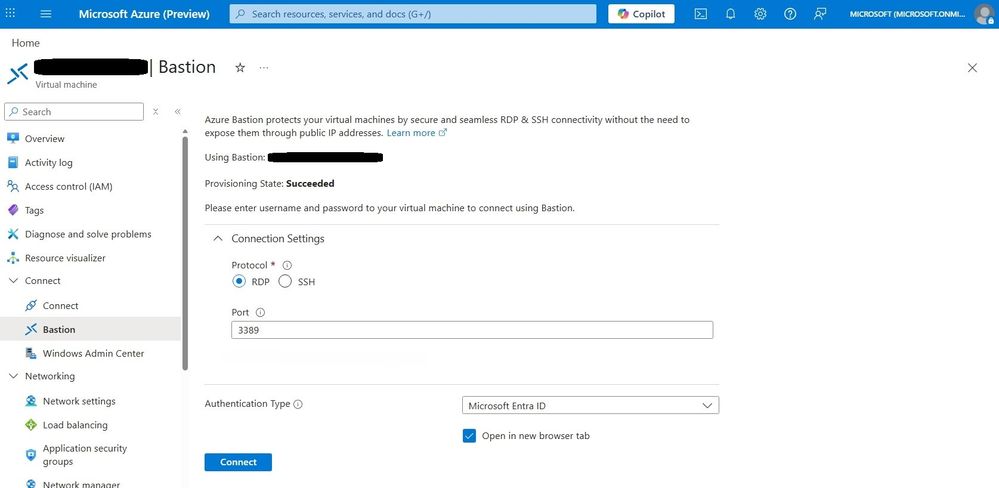 Azure Bastion provides secure RDP and SSH access to Azure virtual machines directly via the Azure portal or via the native SSH/RDP client already installed on your local computer. Previously, Bastion supported Entra ID authentication (formerly AAD) for RDP and SSH connections via native client and for SSH connections via the portal. Today, we are introducing public preview for Entra ID support for RDP connections in the portal, delivering a more seamless and secure experience for users.