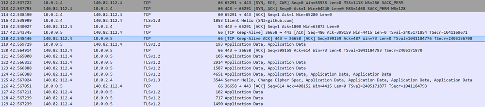 In this scenario, we are connecting from an Azure VM to the public IP via Azure Firewall using Application rules. While the original request originates from the VM with source IP 10.0.2.4, the Layer 4 details differ from the incoming packet because, during application rule evaluation, the firewall establishes a new outbound connection acting as a proxy. As shown in the image, the SNAT IP of the Azure Firewall instance (10.0.0.5) initiates the connection to the public IP 140.82.112.4. HTTP or TLS keys can be used to match incoming and outgoing packets. L7 remains the same. For packet capture in this scenario, the following filters are applied: