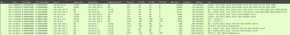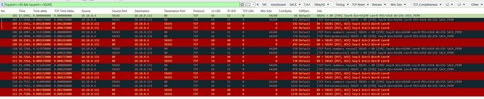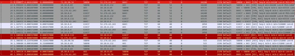 In this scenario we are connecting from a client via Internet to the Azure Firewall’s public IP, using DNAT rules on port 8443. You can see in the screenshot below the incoming request (TCP 3-way handshake) and all the hops until it gets to the Web Server. L3 (and source IP) differs from the incoming packet since its SNATed at L3 while L4 remains the same. For taking the packet capture in this scenario, we are using the following filters: