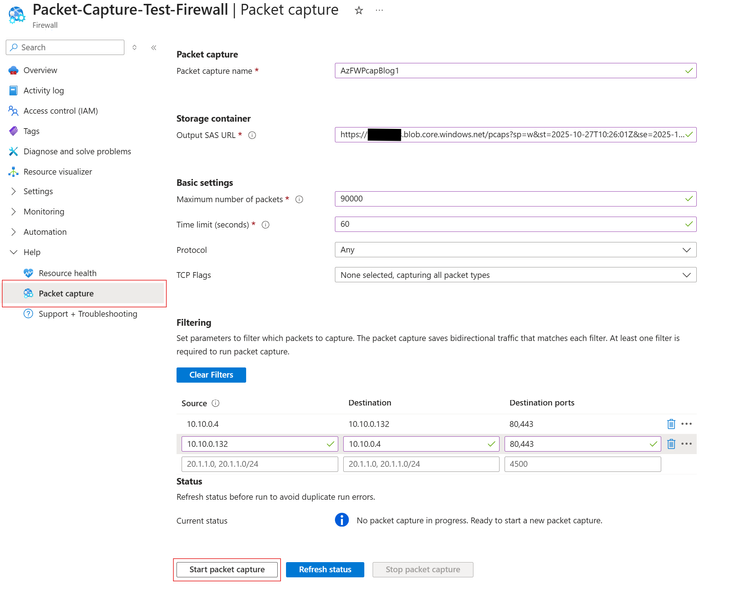- Now, we must go to the Azure Firewall > Packet Capture (under Help) to start running the packet capture.