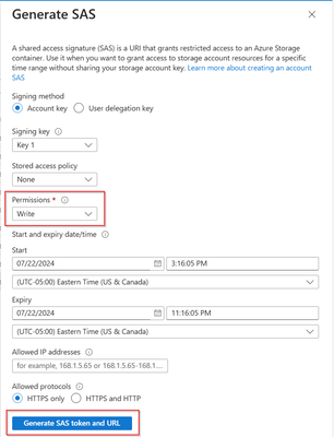 - When defining the parameters of the SAS select “Write” under Permissions, so Azure Firewall will be able to successfully save the packet captures. Then click on “Generate SAS token and URL”.