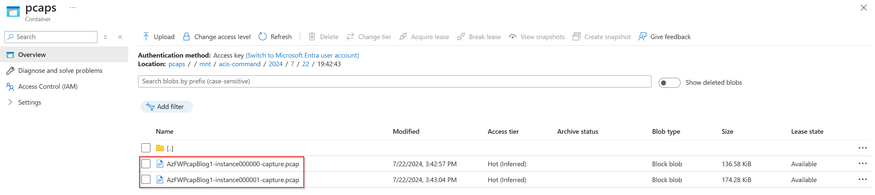 - Once the packet capture is complete, you will navigate to the container used in the storage account and download the pcap files. Note that you will see multiple pcap files, this is because each virtual machine in the backend of the firewall has its own file.