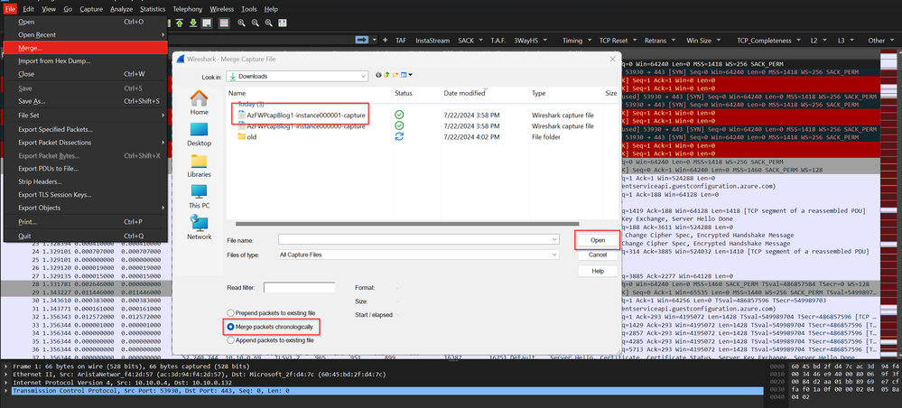 With the pcap files downloaded to your computer, open the files to start your investigation. Since we have multiple files due to the number of active Azure Firewall instances at the time of the packet capture, it may be easier to merge the files. To merge the pcap files, first open one of them using Wireshark and then go to File > Merge and select the second file. There are different ways to merge them, but here we are using “Merge packets chronologically”.