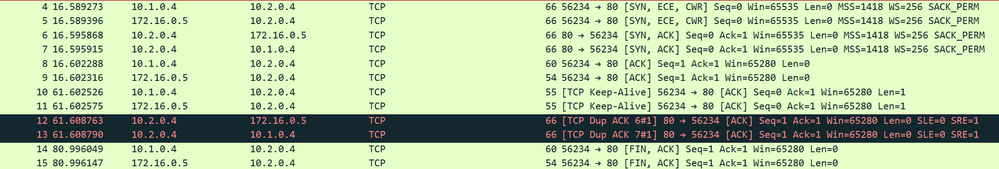 In this scenario, the client VM 10.1.0.4 initiates the connection to the server VM 10.0.2.4 but we have enabled SNAT to happen by default. So, the Firewall’s Private IP 172.16.0.5 (SNAT) will initiate a connection with the destination web server as we can see in the below image. For packet capture in this scenario, the following filters are applied: