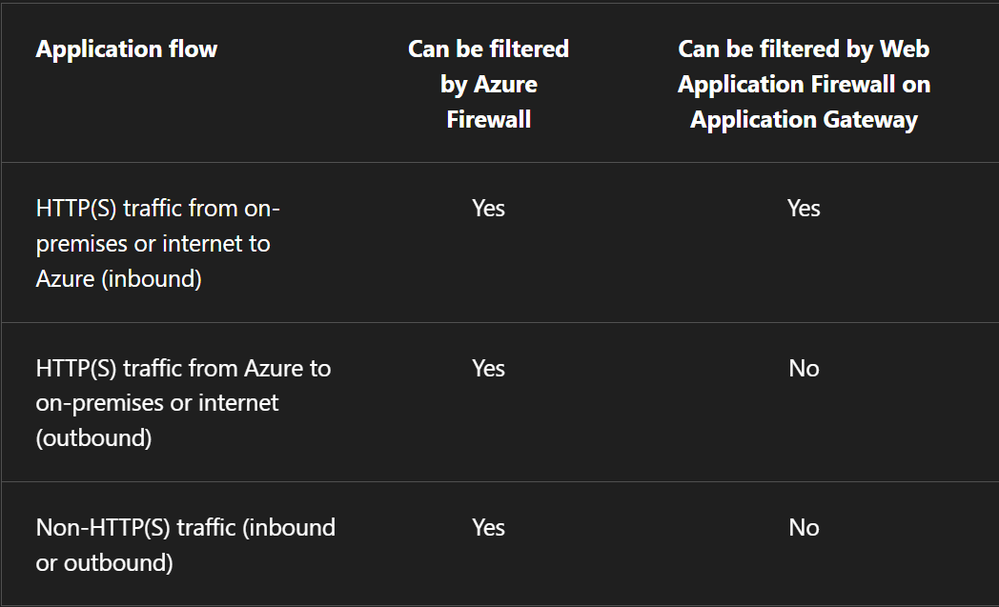 The table below shows the traffic flow that will be filtered by Azure WAF vs Azure Firewall. As you can see, layered security is fundamental to Zero Trust