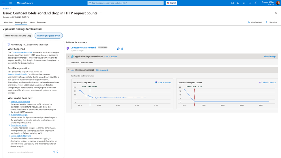 First, we’re excited to usher in the era of agentic cloud operations with Azure Copilot agents. At Ignite 2025, we are announcing the preview of the Azure Copilot observability agent to help you enhance full-stack troubleshooting. Formerly “Azure Monitor investigate”, the observability agent streamlines troubleshooting across application services and resources such as AKS and VMs with advanced root cause analysis in alerts, the portal, and Azure Copilot (gated preview). By automatically correlating telemetry across resources and surfacing actionable findings, it empowers teams to resolve issues faster, gain deeper visibility, and collaborate effectively. Learn more here about the observability agent and learn about additional agents in Azure Copilot here.