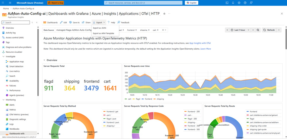 Dozens of pre-built Grafana dashboards for Azure Kubernetes Services, Application Insights, Storage Accounts, Cosmos DB, Azure PostgreSQL, OpenTelemetry metrics and dozens of other Azure resources are included and enabled by default. Additionally, you can import dashboards from thousands of publicly available Grafana community and open-source dashboards for the supported data sources: Prometheus, Azure Monitor (metrics, logs, traces, Azure Resource Graph), and Azure Data Explorer.