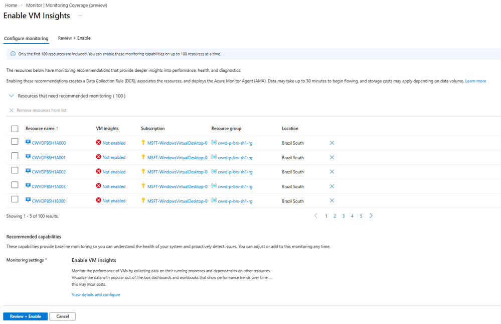 During this preview, you can enable monitoring for up to 100 resources at a time, and an existing Log Analytics workspace or Azure Monitor Workspace is required.