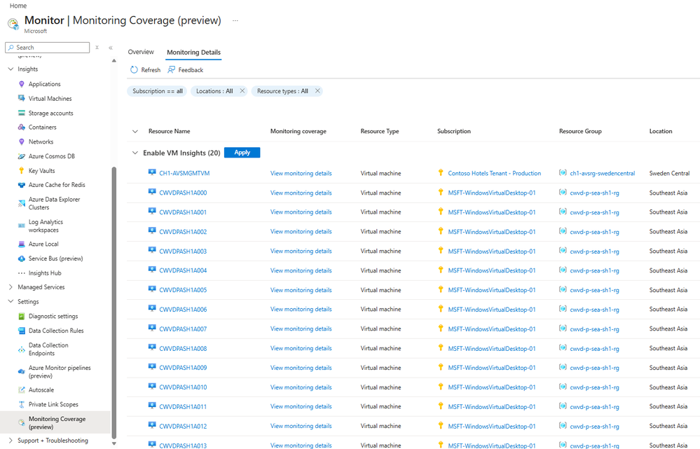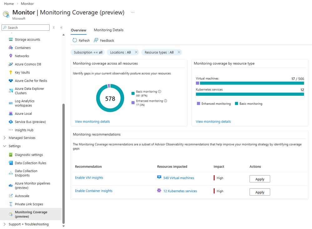 During preview, Monitoring Coverage supports Virtual Machines (VMs) and Azure Kubernetes Service (AKS) clusters. Support for additional Azure services will roll out in future updates.