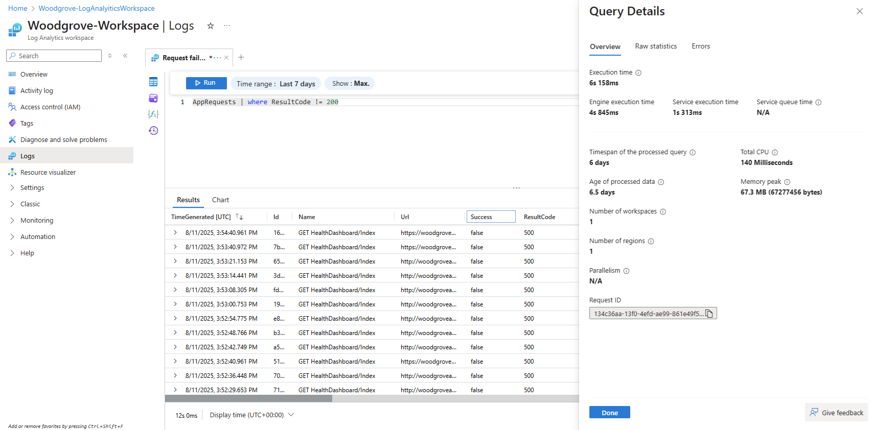 - Execution time breakdown: Engine, Log Analytics Service, and Queue times