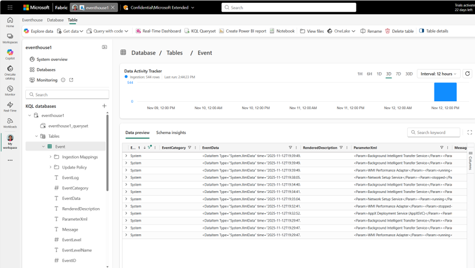 3. Within minutes after your Data Collection Rule (DCR) is deployed, you will see logs in your Fabric environment. From here you can query or build analytics on this and other available datasets.