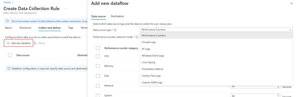 1. Use the new Data Collection Rule creation experience to add a dataflow for any of the supported telemetry types.