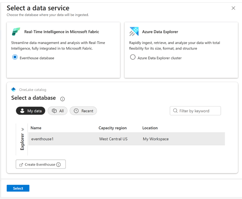 2. Configure an existing Fabric Real Time Intelligence Eventhouse database as your destination. Optionally, you may create a new destination from this UI.