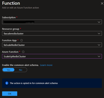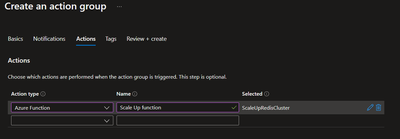 In the action group for this alert rule, we need to configure execution of our scale up function.