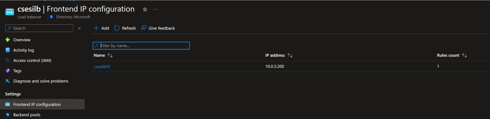 You need to follow this document at first and have a running CSES with internal Load Balancer. The following screenshots are from my environment (Frontend IP using 10.0.3.200, a private IP address, proving it’s an internal Load Balancer):
