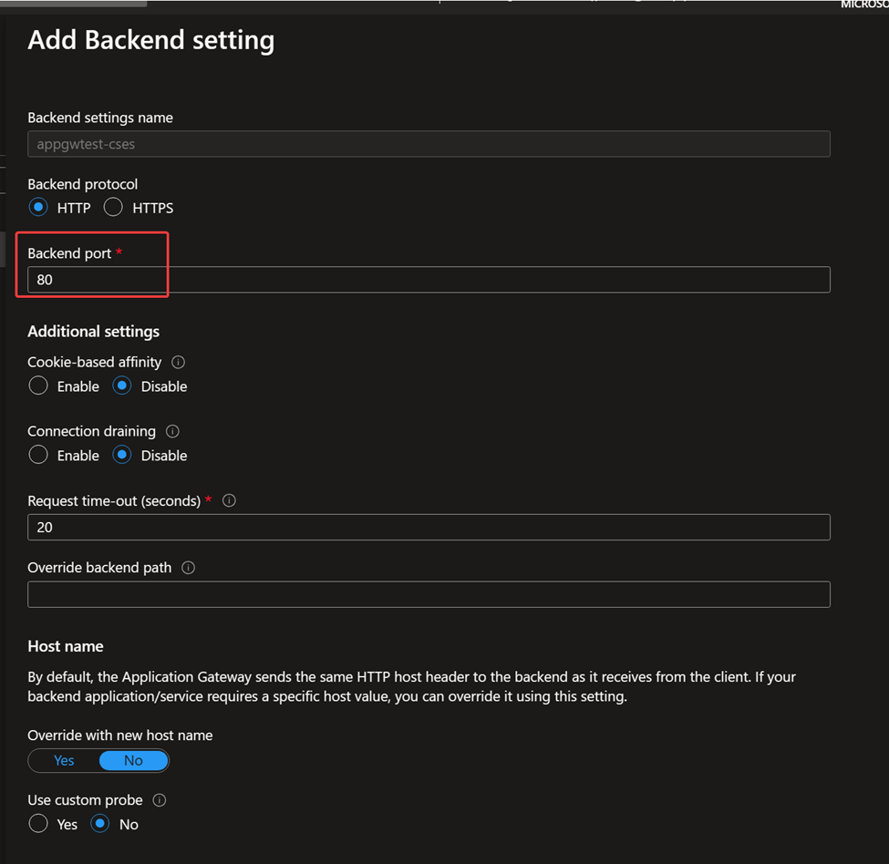 Backend setting: Setting about how the traffic will be forwarded. In this sample, the easiest simple HTTP traffic with port 80 is used (if CSES project is listening on other port like 700, then here it should be configured as 700). If any additional feature is needed such as HTTPS, custom health probe or path override, please kindly create support ticket to Application Gateway team for further assistance.