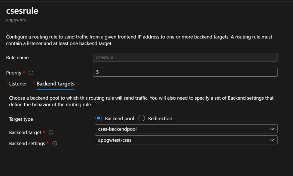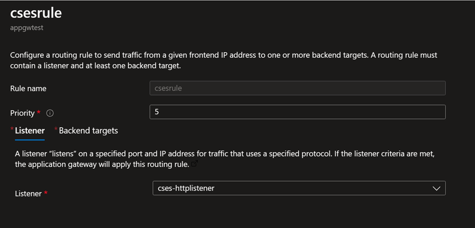 Listener setting: This is about which port of Application Gateway will be used by public Internet to send traffic to CSES. Like here the port 8080 is configured, so when user in public Internet sends traffic to this CSES, he needs to send the traffic to Application Gateway, port 8080. Of course original port 80 can still be used, here using 8080 is to prove that this port can be different from the CSES listening port.