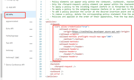 An example here, in the effective policy, I have CORS at global level, and also in the API level. If I send a request from https://coolhailey.developer.azure-api.net I would encounter a CORS error, since it’s not added inside my first CORS policy(global level), although I have it added in the second policy(API level).