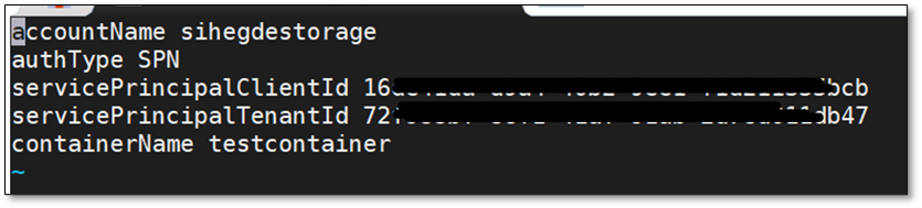 ii. Update the configuration file with Storage account details and Service Principal details. Also, the authType for Service Principal authentication would be SPN as shown below: