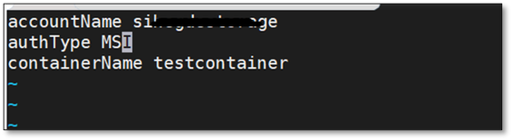 For both scenarios, update the configuration file that was created earlier with the storage account credentials and mention authType as ‘MSI’ as shown below: