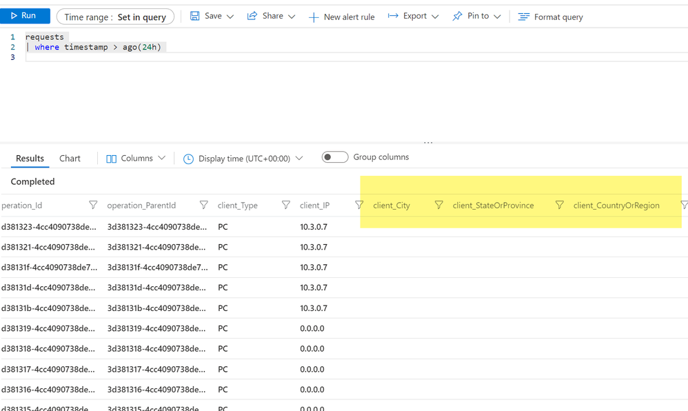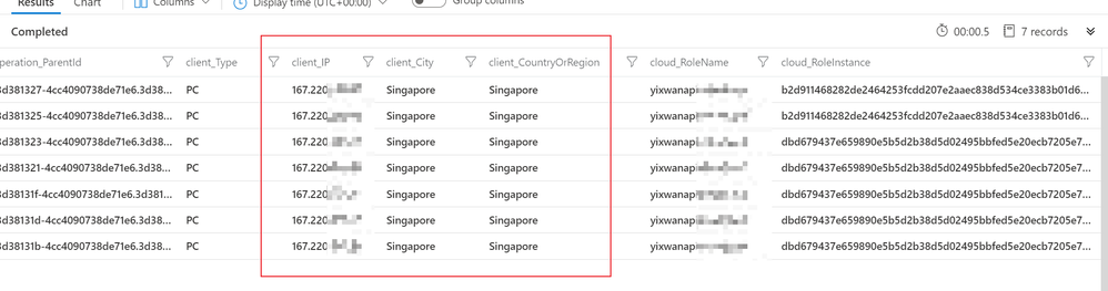 As we can see in the screenshot, the client IP column here is App Gateway’s private IP instead of end users’ actual client public IP. App Insight cannot use this private IP to resolve a correct Geo Location, hence the columns are empty.