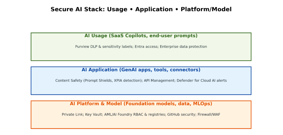 - AI Platform & Model (foundation models, data, MLOps) — Private Link, Key Vault/Managed HSM, RBAC controlled workspaces and registries (Azure AI Foundry/AML), GitHub Advanced Security, and platform guardrails (Firewall/WAF/DDoS) harden data paths and the software supply chain end-to-end.