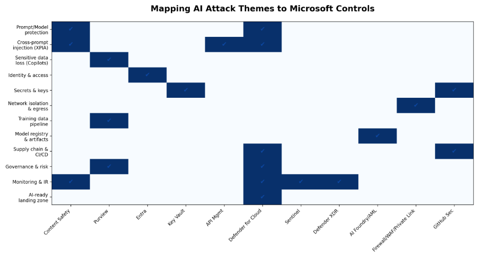This heatmap ties common attack themes (prompt injection, cross-prompt injection, sensitive data loss, identity & keys, network egress, training data, registries, supply chain, governance, monitoring, and landing zone) to the primary Microsoft controls you’ll deploy. Use it to drive backlog prioritization.