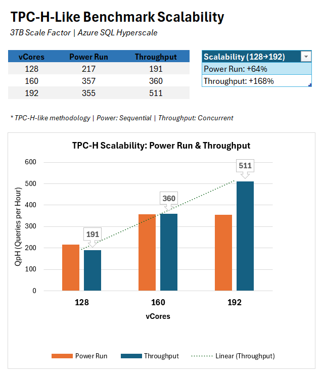 Strong scale-up efficiency observed beyond 128 vCores: Moving from 128 → 160 → 192 vCores shows consistent performance gains, demonstrating that Hyperscale Premium-series continues to scale effectively at higher core counts.