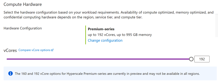 We are excited to announce the public preview of 160 and 192vCore compute sizes for Premium-series hardware configuration in Azure SQL Database Hyperscale. Since the introduction of Premium-series hardware configurations for Hyperscale in November 2022, many customers have successfully used larger vCore configurations to consolidate workloads, reduce shard counts, and improve overall application performance and stability.