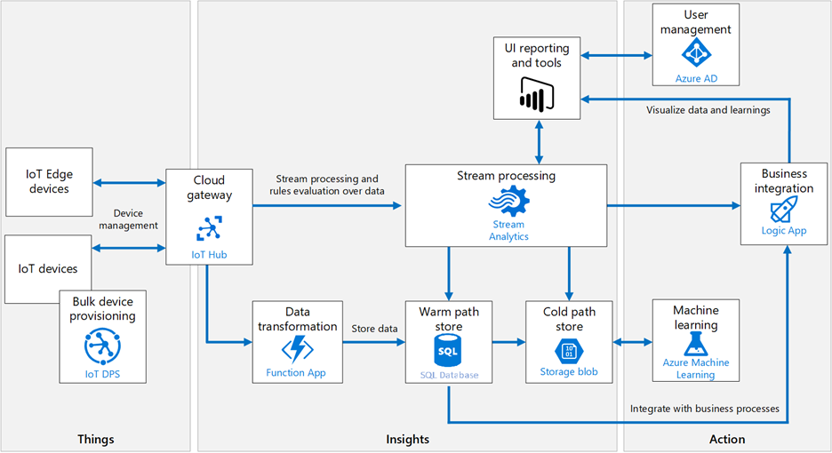 Thankfully, Azure platform offers a full portfolio of PaaS services that plug in to each other seamlessly and are covering all the needs of a modern and scalable IoT solution, as the following architectural diagram represents: