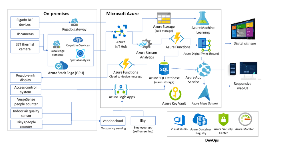 The solution is named RxWell™—a comprehensive, public-health–based, data-driven program that merges physical and digital assets to help keep employees informed and supported during the “new abnormal” and beyond. Powered by the Internet of Things (IoT) and the intelligent edge, and firmly rooted in responsible artificial intelligence (AI) principles, RxWell combines real-time computer vision, sensors, AI, mobile apps and dashboards, and in-person service offerings. And Azure is making it all possible.