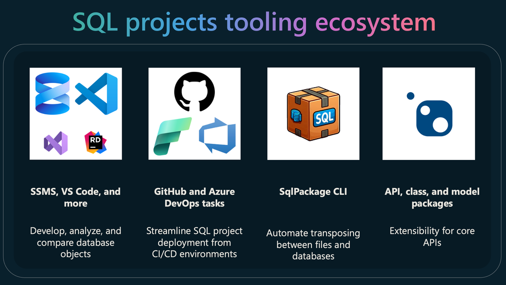 SQL projects in SSMS are based on Microsoft.Build.Sql projects and requires a minimum SDK version of 2.1.0. While a preview of SSDT for Microsoft.Build.Sql projects is available for Visual Studio 2022, only the original SQL projects are supported in SSDT for Visual Studio 2026. The SQL projects tooling ecosystem includes multiple development environments, CI/CD integrations, and even customization through the DacFx .NET library. Our goal is that this ecosystem enables you and your teams to manage SQL database schemas and deployments in a more automated and reliable way, and this requires that tools used by your teams surface SQL projects such that they can be integrated into your existing workflows.